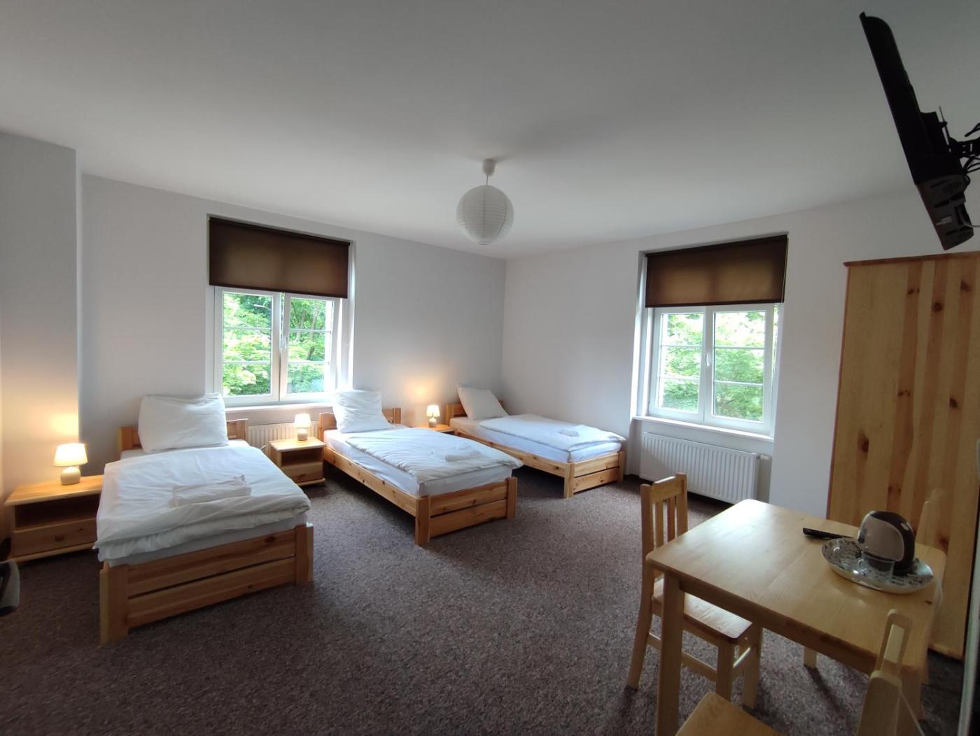 Pokój rodzinny (5 osób dorosłych). The family room provides a wardrobe and an electric kettle, as well as a private bathroom featuring a shower. The unit offers 4 beds. Rodzinny - 5 osobowy. Powierzchnia pokoju ok.: 20 mkw. ;