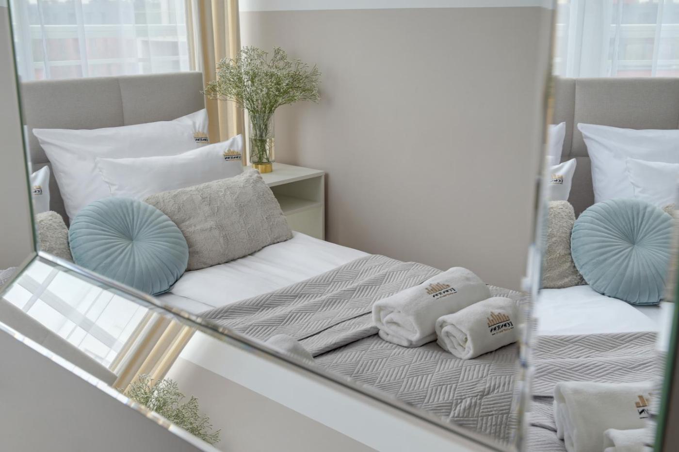 Apartament typu Deluxe z 2 sypialniami i balkonem. Featuring a private entrance, this apartment consists of 1 living room, 2 separate bedrooms and 1 bathroom with a shower and a hairdryer. Guests can make meals in the kitchenette that is equipped with a stovetop, a refrigerator, a dishwasher and kitchenware. The apartment provides a flat-screen TV with cable channels, a washing machine, soundproof walls, a tea and coffee maker as well as city views. The unit offers 3 beds. Apartament - 7 osobowy. Powierzchnia pokoju ok.: 60 mkw. ;