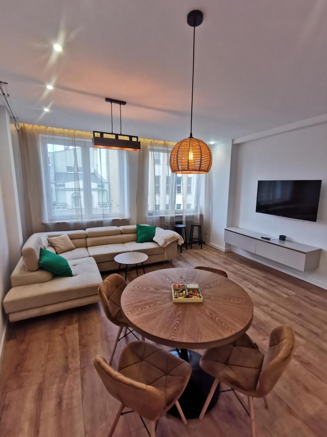 Apartament z 1 sypialnią i balkonem. Featuring a private entrance, this apartment consists of 1 living room, 1 separate bedroom and 1 bathroom with a walk-in shower and a bidet. Meals can be prepared in the well-fitted kitchen, which is equipped with a stovetop, a refrigerator, a dishwasher and a tea and coffee maker. The apartment provides a flat-screen TV with streaming services, a washing machine, soundproof walls, a minibar as well as city views. The unit offers 2 beds. Apartament - 4 osobowy. Powierzchnia pokoju ok.: 56 mkw.