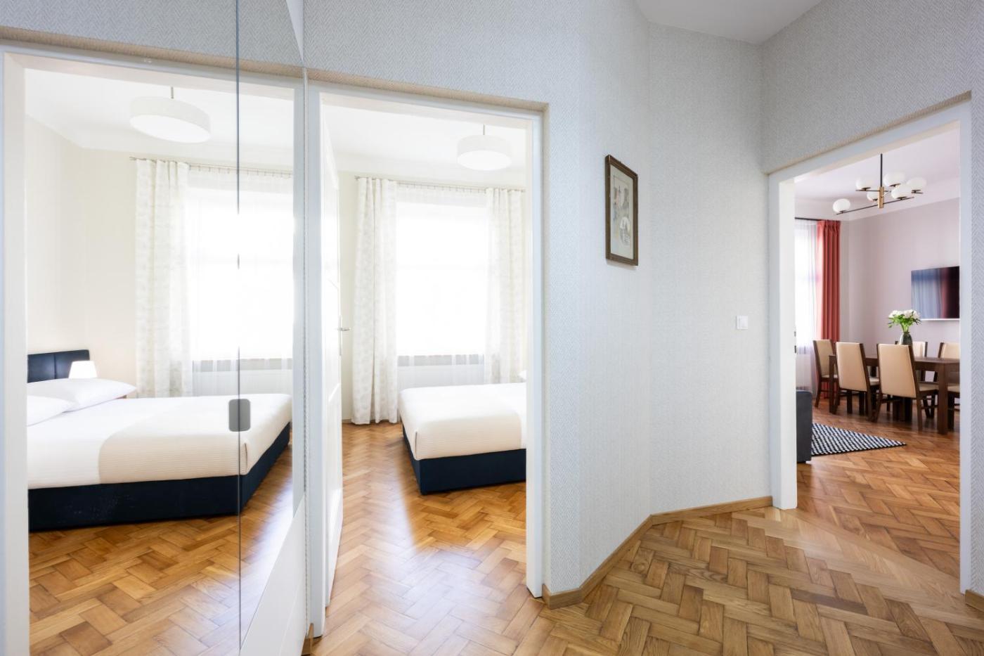 Apartament z 1 sypialnią. Apartament ten mieści salon, oddzielną sypialnię oraz łazienkę z prysznicem i bezpłatnym zestawem kosmetyków. W dobrze wyposażonym aneksie kuchennym przygotowano płytę kuchenną, zmywarkę do naczyń, lodówkę i przybory kuchenne. Dodatkowe udogodnienia w tym apartamencie z widokiem na miasto to drewniana podłoga, część wypoczynkowa z telewizorem z płaskim ekranem, pralka oraz zestaw do parzenia kawy i herbaty. Do dyspozycji gości są 2 łóżka. Apartament - 4 osobowy. Powierzchnia pokoju ok.: 50 mkw.