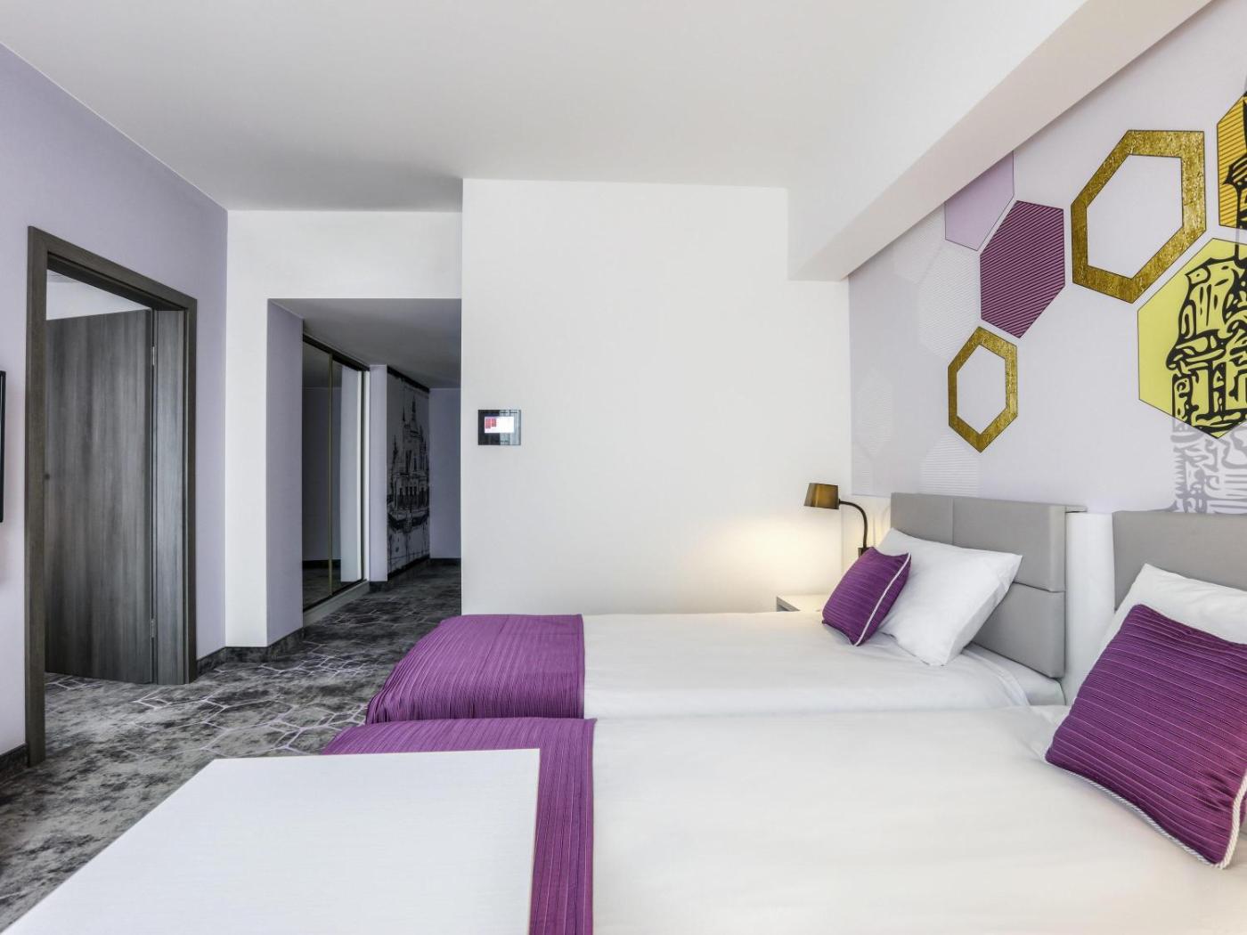 Pokój rodzinny z łóżkiem podwójnym i 2 łóżkami pojedynczymi. Apartament dysponuje prywatną łazienką z prysznicem typu walk-in, wanną, suszarką do włosów i bezpłatnymi przyborami toaletowymi. Ten przestronny, klimatyzowany apartament typu suite ma dźwiękoszczelne ściany. Wyposażenie obejmuje telewizor z płaskim ekranem i dostępem do kanałów satelitarnych, szafę oraz zestaw do parzenia kawy i herbaty. Z okien roztacza się widok na miasto. Apartament typu Suite - 5 osobowy. Powierzchnia pokoju ok.: 53 mkw.